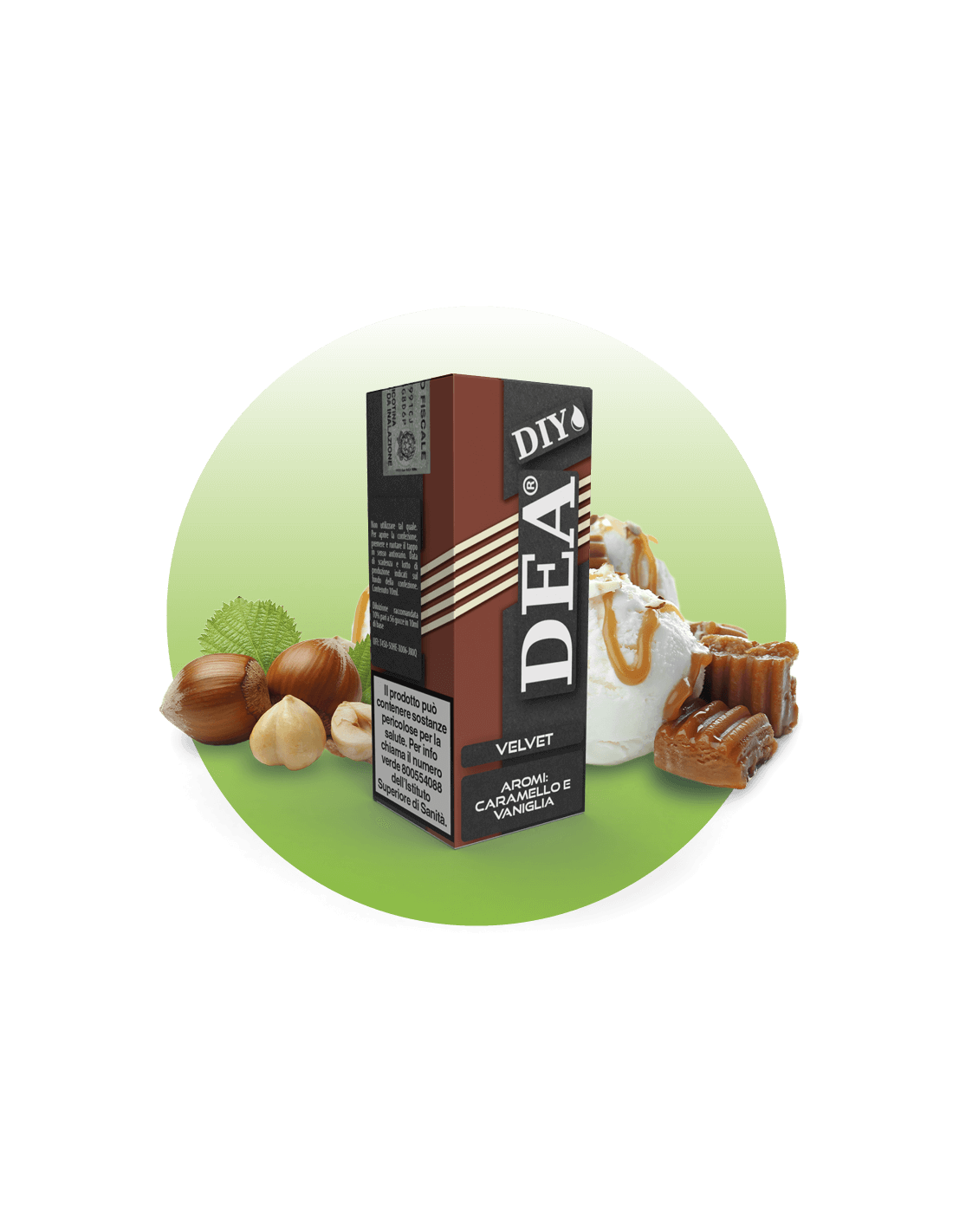 10 Velvet DIY Aroma 10ml - DEA e' un aroma concentrato per sigaretta elettronica, un aroma che unisce la dolcezza e la morbidezza del caramello e vaniglia, con la naturale croccantezza della nocciola. Un gusto ricco, corposo e complesso, in cui le note rotonde della nocciola si mischiano copn quelle dolci della vaniglia e del caramello. Sicuramente uno dei gusti piu' "golosi" da provare, questo mix equilibrato crea un sapore caldo e vellutato in grado di conquistare ogni tipo di palato!