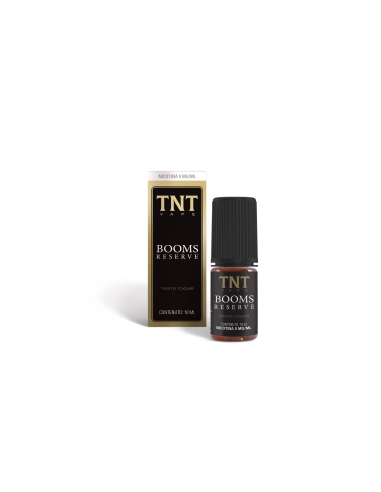Booms Reserve Liquido 10ml - TNT Vape fornito in flacone di plastica 10ml e con tappo di sicurezza. Potrai scegliere la tua fragranza preferita in diverse gradazioni di nicotina 0,3,6,9mg/ml. La sua concentrazione 50VG/50PG ti permetterà di utilizzare sistemi MTL per uno svapo da guancia.