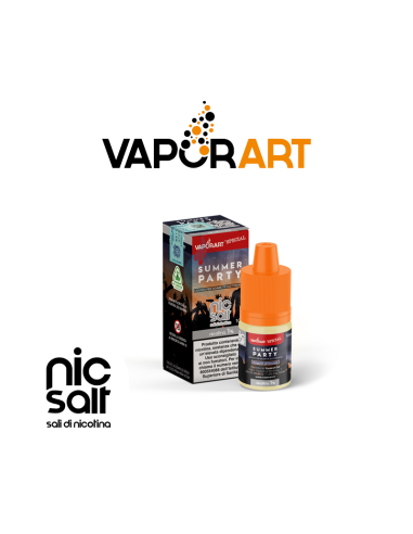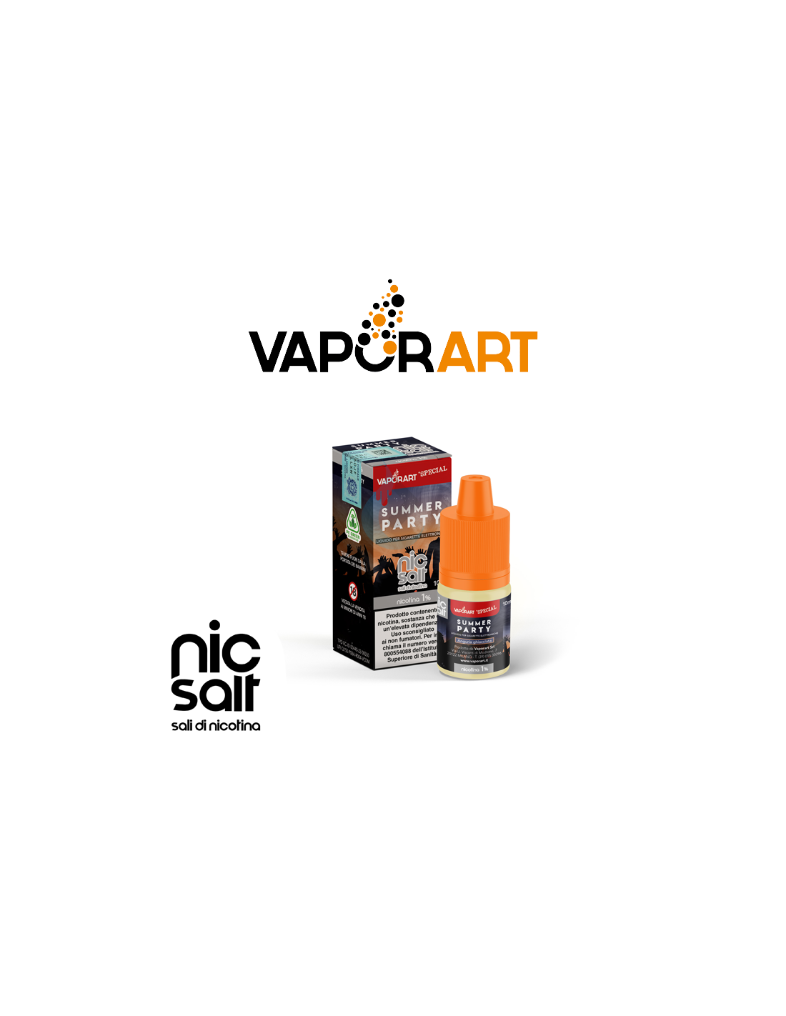 Summer Party Sali di Nicotina - VaporArt è un prodotto Made in Italy della linea Nic.Salt VaporArt, fornito in flacone di plastica 10ml e con tappo di sicurezza. Potrai scegliere la tua fragranza preferita con gradazione di nicotina da 10mg/ml o 20mg/ml. I sali di Nicotina si differenziano dalla nicotina libera per un assorbimento più rapido al corpo, una sensazione meno irritante alla gola e una soddisfazione più realistica della sigaretta tradizionale, tutto ciò aiuterà a ridurre il desiderio in modo graduale e più veloce. La sua concentrazione 50VG/50PG ti permetterà di utilizzare sistemi MTL e Cloud Chasing per uno svapo da guancia e da polmone.