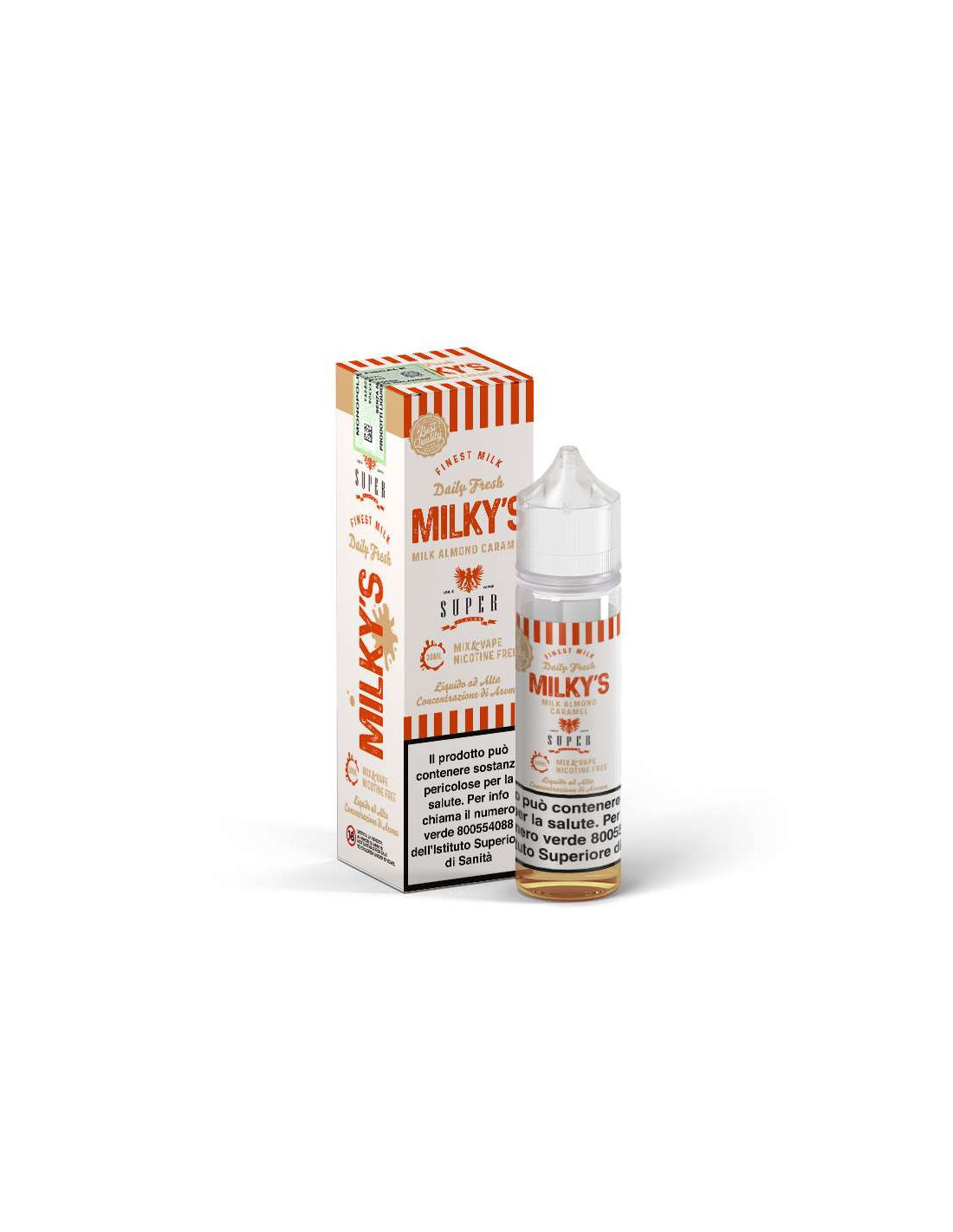 Milky's Almond Caramel Mix&Vape 30 ml - VaporArt è un prodotto Made in Italy della Linea Special di Vaporart, fornito in flacone di plastica 60ml e con tappo di sicurezza. Potrai scegliere la tua fragranza preferita con gradazione di nicotina 0mg/ml. La sua concentrazione 50VG/50PG ti permetterà di utilizzare sistemi MTL e Cloud Chasing per uno svapo da guancia e da polmone.