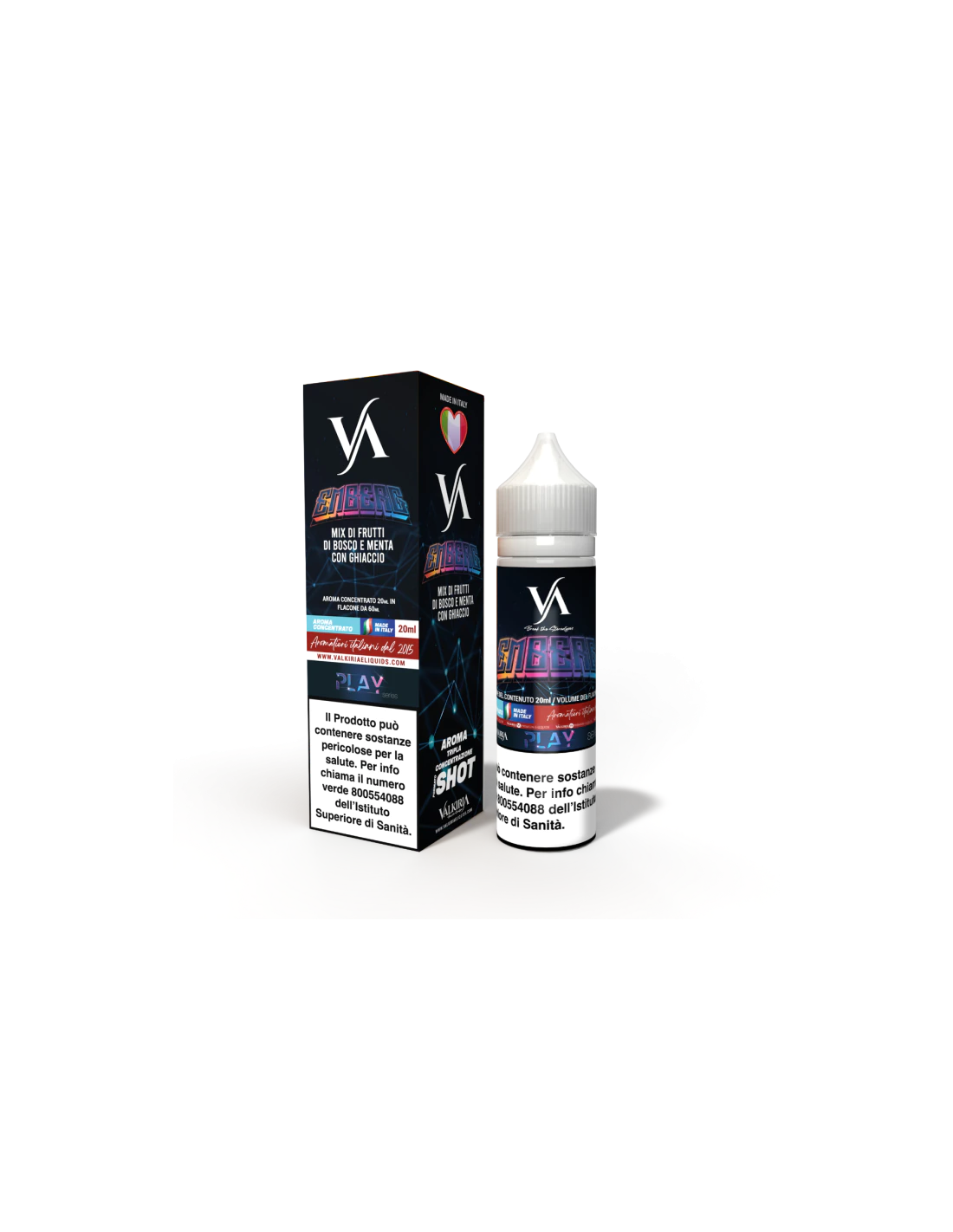 Emberg Play Aroma Shot 20ml 0mg - Valkiria in formato da 20ml è un Aroma Scomposto, formato per essere miscelato e diluito. Il sistema Shot permette di preparare con semplicità la tua miscela preferita. Sarà sufficiente aggiungere 30/40ml di base VG Glicerina Vegetale all’aroma shot per ottenere un liquido pronto da svapare.